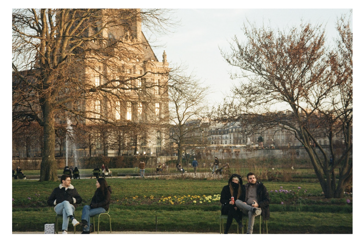 Against the backdrop of an iconic, historic Paris building – The Luxembourg Palace – people convene in the Luxembourg Gardens, reading books, chatting, and observing. Again, there is no separation of space besides the existence of freely placed chairs, diminishing the barriers between strangers that usually exists in daily life. Conversations are overheard by adjacent visitors, extended feet are encouraged. There is an informality here that juxtaposes the norms of daily Parisian life, a signifier of this garden as a catalyst for community and unity.